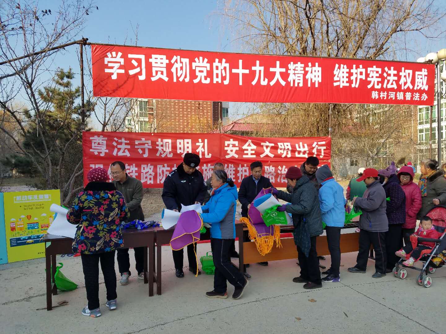 12月1日韩村河司法所联合多部门在雅苑社区开展了以“尊法守规明礼 安全文明出行”、“强化铁路防护措施 维护铁路法治秩序”为法治主题的“12.2”交通安全日综合普法宣传活动。由此拉开了“12.4”普法系列综合法治宣传活动的序幕。